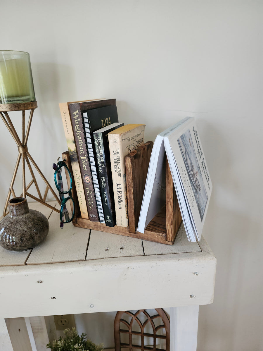 This compact bookshelf makes the perfect addition to your nightstand. It allows you to keep your favorite books organized and easily accessible for late-night or early-morning reading. When you are done reading, simply put the book on the end piece for an easy marker! We've attached a little hook on the end for the ones that need special glasses to read🧐